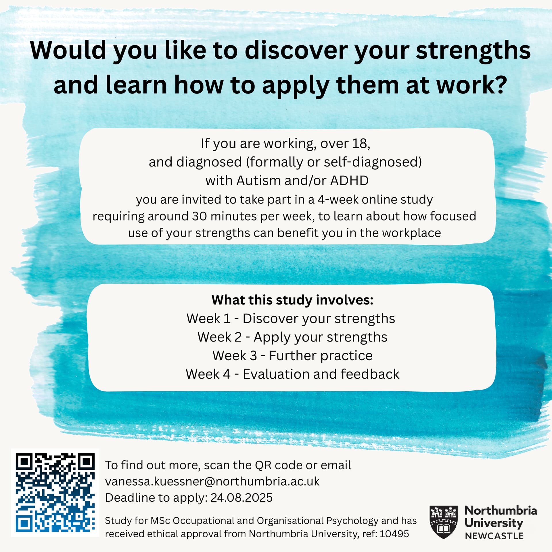 Bei dieser Studie handelt es sich um eine Intervention (vollständig online), bei der man die eigenen Stärken entdecken kann. In einem 4-wöchigen Zeitraum lernt man, wie man die Stärken am Arbeitsplatz besser einsetzen kann.