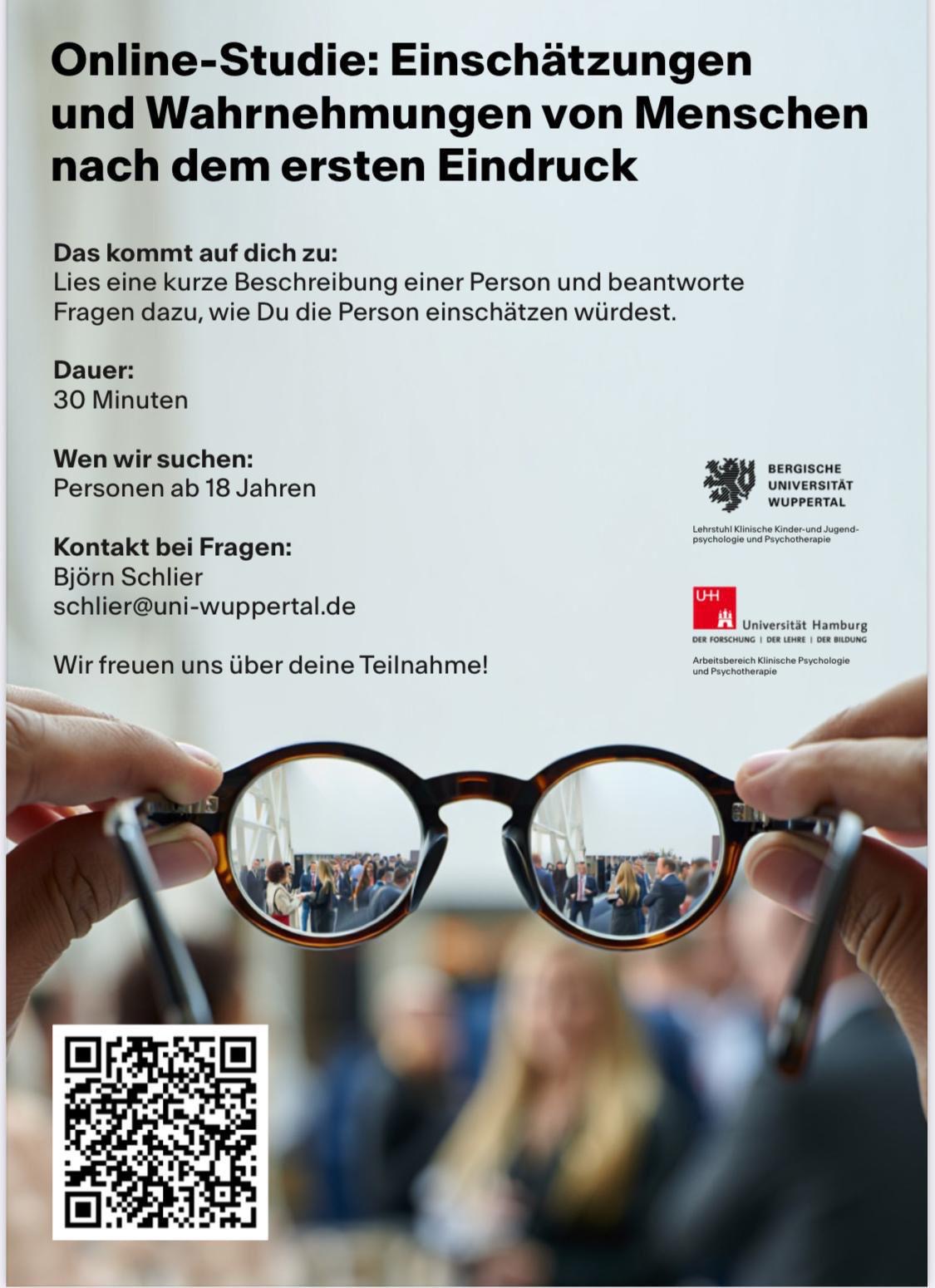 Ich bin Psychologiestudentin an der Bergischen Universität Wuppertal und führe im Rahmen meiner Bachelorarbeit zusammen mit der Uni Hamburg und unter der Betreuung von Dr. Björn Schlier (Email: schlier@uni-wuppertal.de) eine Studie zum Thema Neurodiversität durch. Nähere Informationen zum Inhalt der Studie darf ich aus Forschungsgründen leider noch nicht geben (