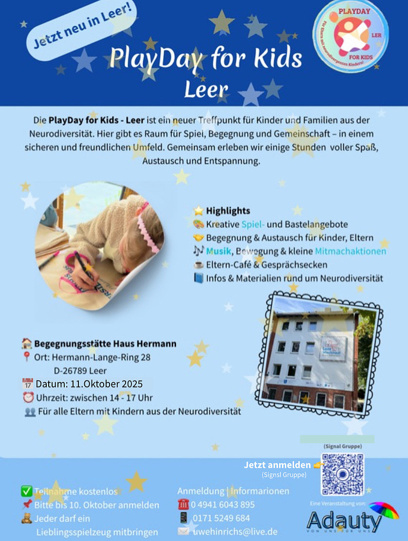 Und: Der PlayDay for Kids (PDfK) läuft bereits in mehreren Städten erfolgreich – mit ersten Treffen, viel Freude, Bewegung und Begegnung für Familien aus der Neurodiversität.
