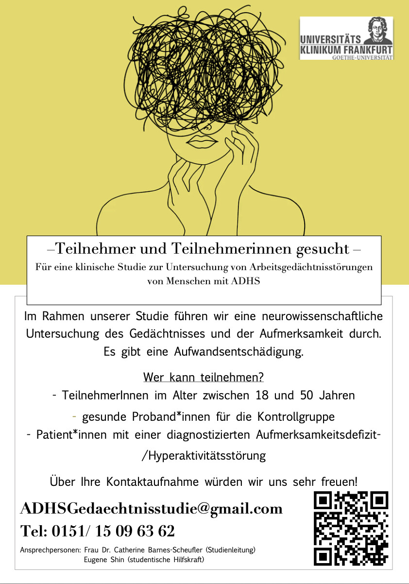 Teilnehmer gesucht für eine klinische Studie zur Untersuchung von Arbeitsgedächtnisstörungen von Menschen mit ADHS !
